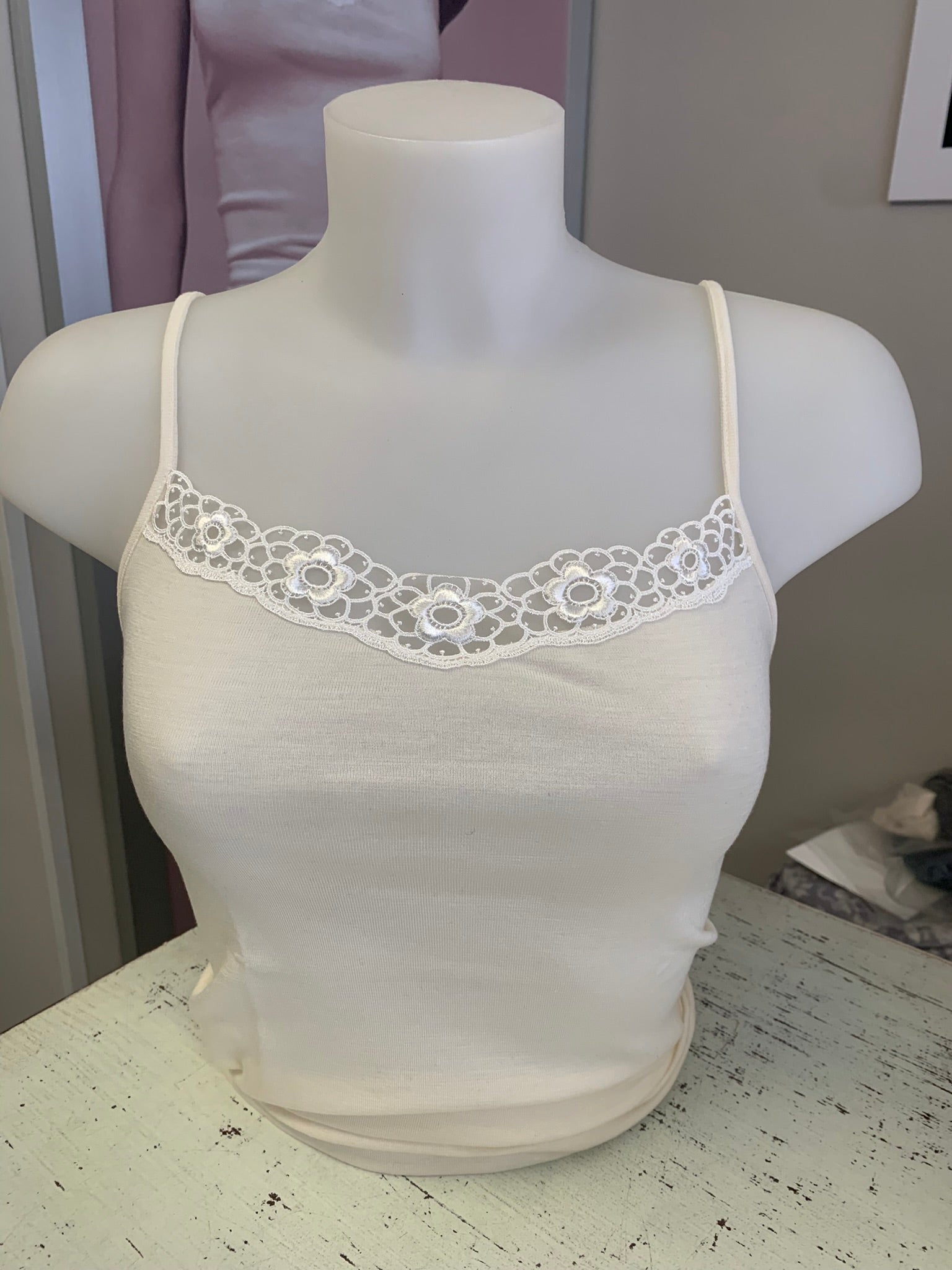 Lisanza canotta lana seta a V - con bordo in pizzo macramè floreale lineare (Art. 1658)
