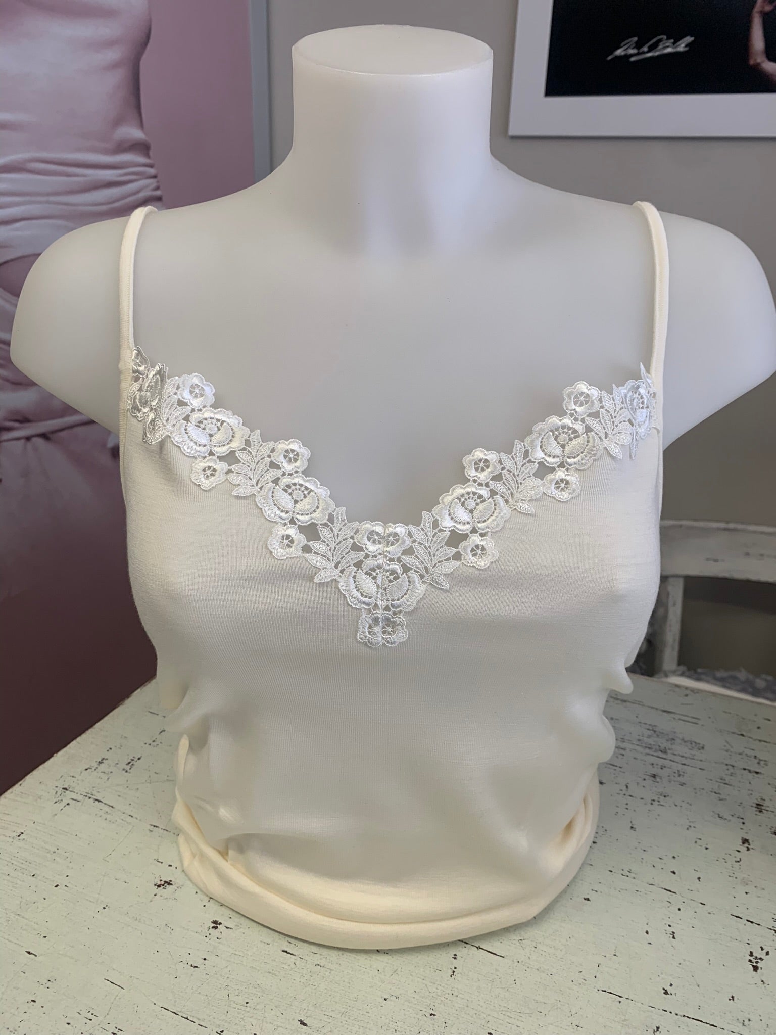 Lisanza canotta lana seta a V con pizzo macramè a punta centrale (Art. 1149)