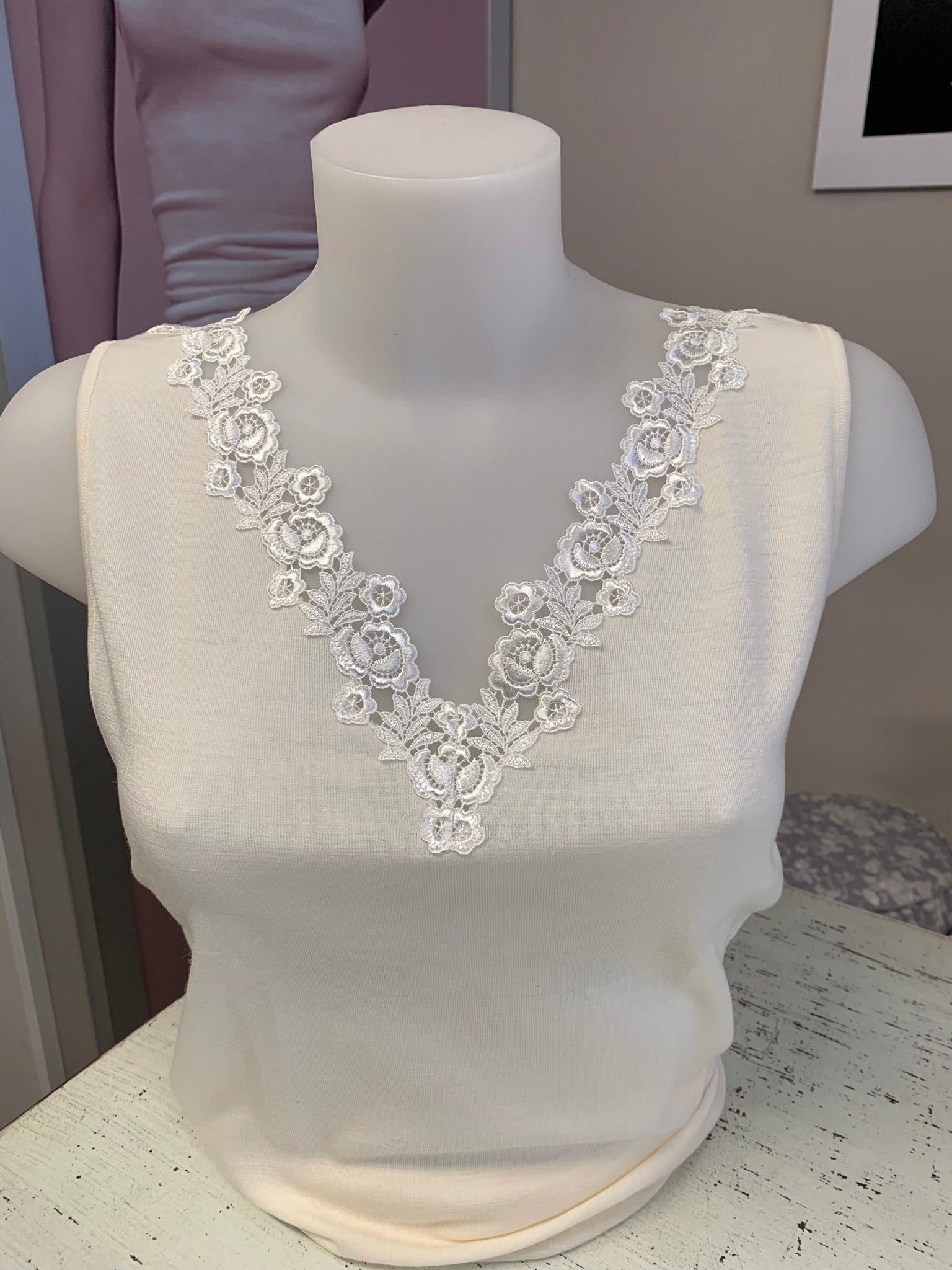 Caratteristica Unica: Pizzo Largo con Motivo Floreale Denso che decora lo scollo a V, creando un bordo ricamato di grande effetto visivo.